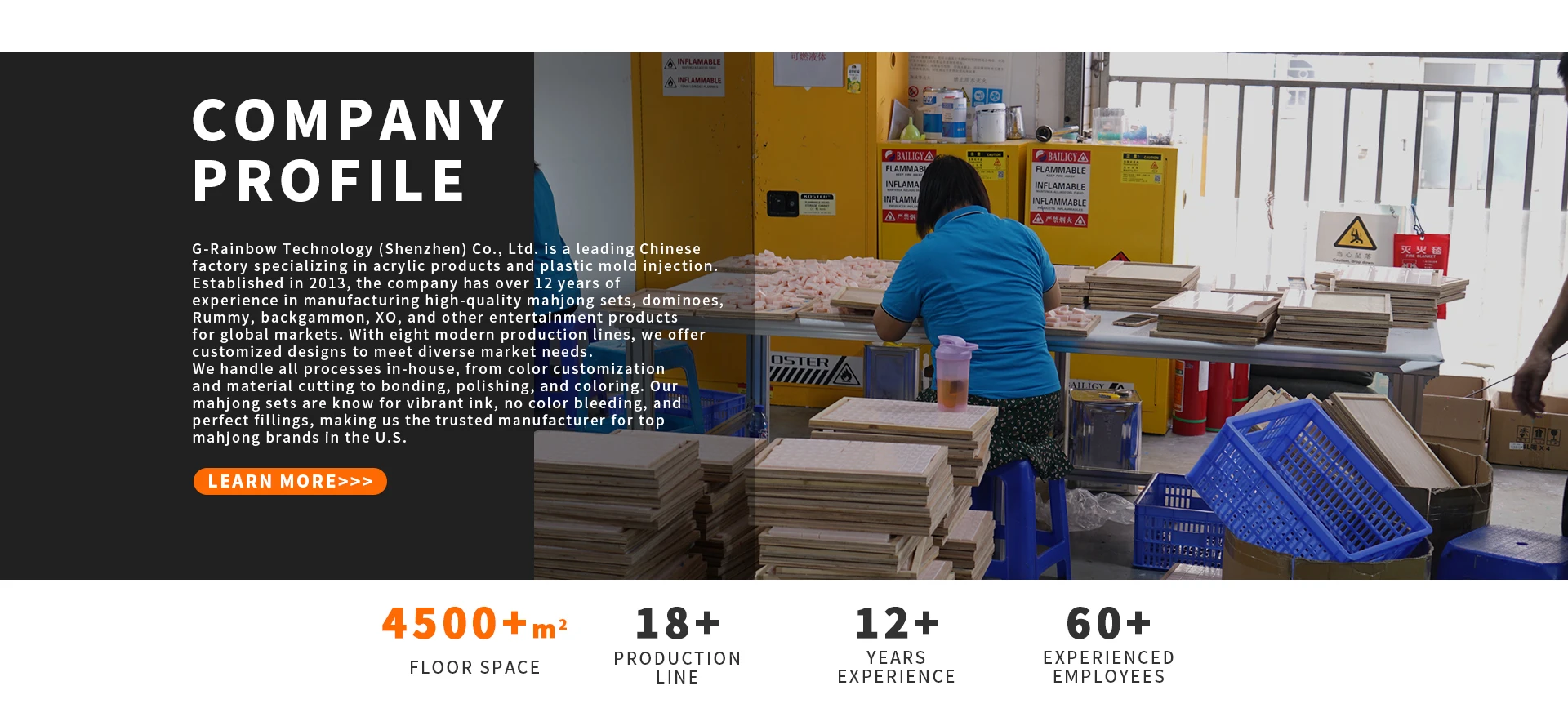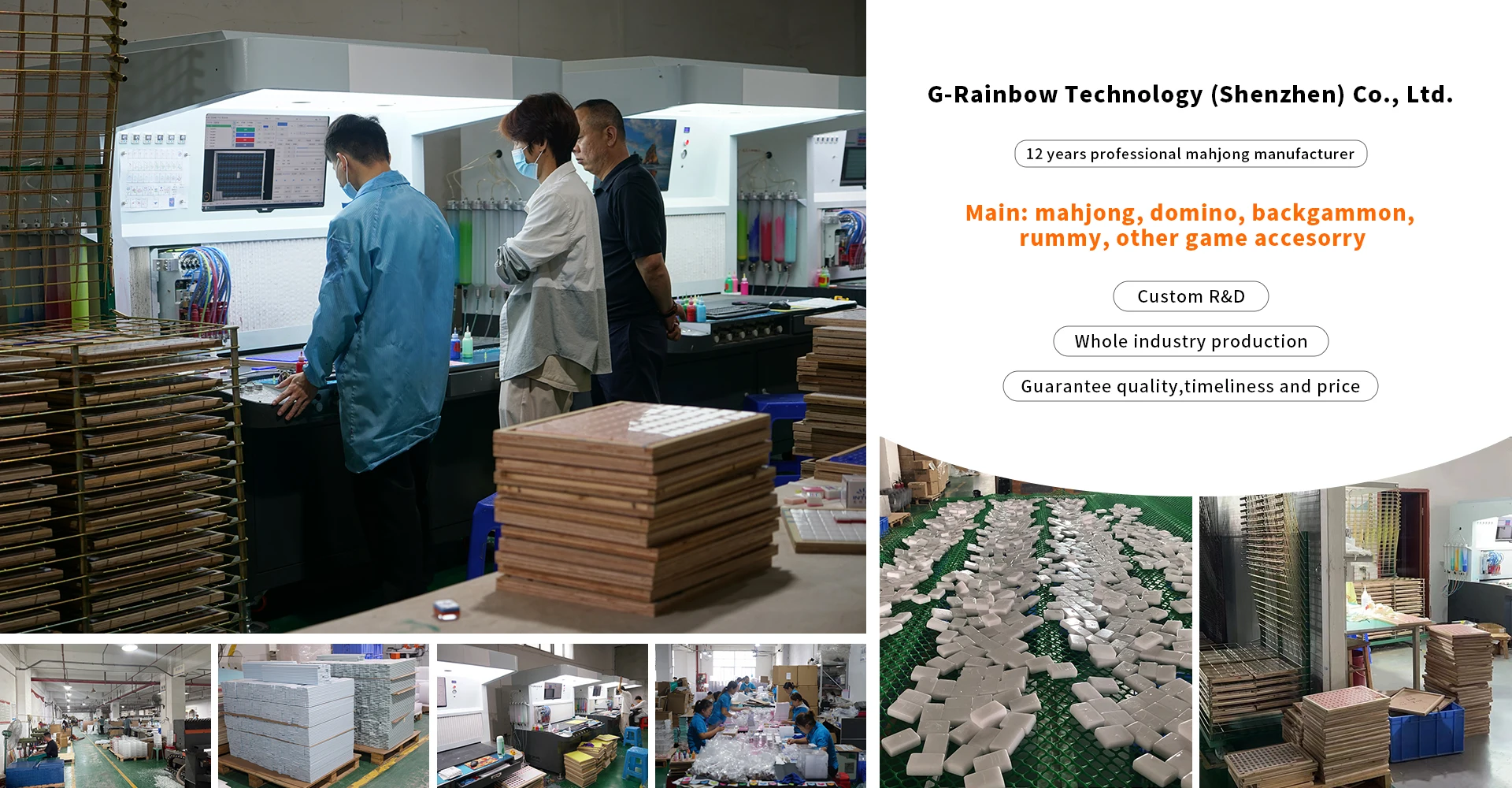 G-Rainbow Technology (Shenzhen) Co., Ltd. is a leading Chinese factory specializing in acrylic products and plastic mold injection. Established in 2013, the company has over 12 years of experience in manufacturing high-quality mahjong sets, dominoes, Rummy, backgammon, XO, and other entertainment products for global markets. With eight modern production lines, we offer customized designs to meet diverse market needs. We handle all processes in-house, from color customization and material cutting to bonding, polishing, and coloring. Our mahjong sets are know for vibrant ink, no color bleeding, and perfect fillings, making us the trusted manufacturer for top mahjong brands in the U.S.